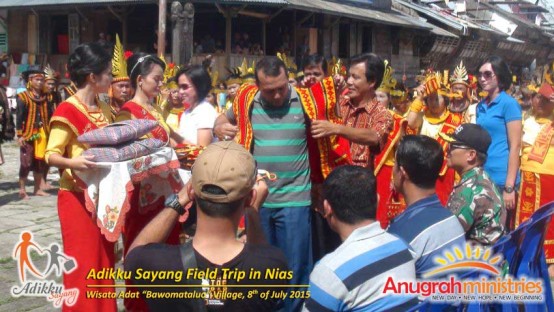 Setibanya di lokasi Desa Wisata Adat “Bawomataluo” Tim Anugrah Ministries, bersama Ketua Distrik ALC Nias dan panitia lokal melapor ke Kepala Desa setempat. Beliau memberikan sambutan yang sangat baik, bahkan sangat mendukung acara ini. Pukul 11.00 WIB, kami memulai acara Field Trip dengan mengadakan Ibadah Ucapan Syukur terlebih dahulu. Lalu dilanjutkan dengan makan siang bersama. Seusai makan, kami mendengarkan pengarahan singkat tentang Desa Wisata Adat “Bawomataluo” oleh Pemandu Adat setempat, sambil menunggu dilangsungkannya Pagelaran Adat Tarian Perang dan Lompat Batu. Di sela-sela pengarahan berlangsung, murid-murid dari Program Beasiwa Adikku Sayang tidak malu-malu mengajukan pertanyaan. Ada sekitar 13 anak dari berbagai center yang mengajukan pertanyaan. Semua pertanyaan sangat berbobot dan dapat dijawab dengan tepat oleh pemandu adat setempat.