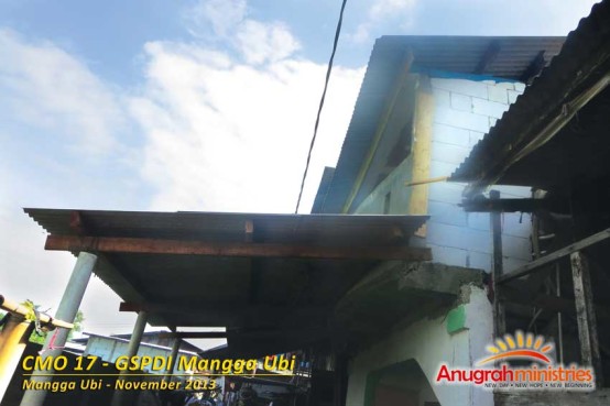 Masih ingat dengan CMO kita yang pertama? Gereja GSPDI Mangga Ubi yang telah rampung kami MakeOver di tahun 2008, di awal tahun 2013 ini tiba-tiba balkon lantai duanya ambruk karena rayap. Tanpa berpikir panjang, kami memutuskan untuk merenovasi balkon tersebut. Gembala Sidangnya, Pdt. Parulian Butar-Butar juga mengusulkan agar bukan saja balkon yang diperbaiki, tapi juga dibuatkan awning sampai ke depan jalan. Supaya jemaat tidak kehujanan bila masuk ke gedung gereja. Selain itu, bila ada acara khusus (kebaktian Natal, dsb) dan jumlah jemaat yang hadir membludak, maka kursi-kursi bisa ditambahkan di luar, di bawah awning tersebut. Itulah yang kami lakukan dalam CMO yang ke 17 ini.