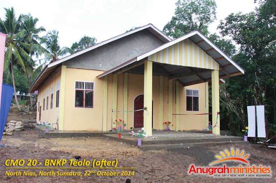BNKP Teolo adalah proyek gereja pertama kami di Pulau Nias. Nias adalah salah satu pulau terluar di seberah Barat Indonesia. 28 Maret 2005, Pulau Nias diguncang oleh sebuah gempa bumi besar dengan kekuatan 8.6 SR. Sekitar 1.000 orang kehilangan nyawanya dan 300 bangunan hancur. Salah satu dari pada bangunan itu adalah gedung gereja BNKP Teolo. Banyak orang telah datang dan menawarkan bantuan, tetapi proyek ini tidak pernah terlaksana dengan baik. Pada waktu kami datang mensurvey lokasi ini sekitar November 2012, kami melihat sebuah konstruksi bangunan yang hanya terdiri dari empat pilar saja dan sedikit tembok. Sedangkan ibadah direlokasi pada penampungan sementara yang terbuat dari gubuk yang sudah sangat reot, jelek dan rusak. Mereka telah bertahun-tahun berdoa agar Tuhan menjawab, dan akhirnya Anugrah Ministries adalah team yang dikirim oleh Tuhan untuk menolong mereka.