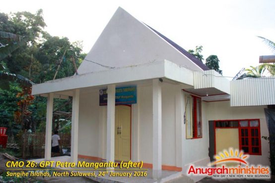 Anugrah Ministries terus berkarya bagi kemuliaan Tuhan melalui program Church Make Over. Dengan Anugrah Tuhan, setelah melewati proses pembangunan selama kurang lebih satu tahun, maka pada hari Minggu, 24 Januari 2016, proyek Church MakeOver yang ke 26 (CMO 26) di GPT Petra Manganitu, yang terletak di ujung Utara Indonesia, tepatnya di Desa Mala, Kecamatan Manganitu, Kabupaten Sangihe, Provinsi Sulawesi Utara dapat diresmikan. Sore itu cuaca hujan, namun tidak menyurutkan semangat seluruh jemaat dan para undangan untuk datang menghadiri acara peresmian tersebut.